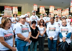 Com faixas, cartazes e camisetas denunciando os sete anos de impunidade, a manifestação em frente ao Tribunal Regional Federal da 1ª Região (TRF-1) contou com a participação de duas viúvas dos auditores que perderam a vida: Helba Soares, viúva de Nelson; e Genir Lage, viúva de João Batista.