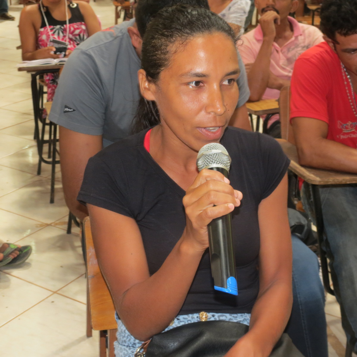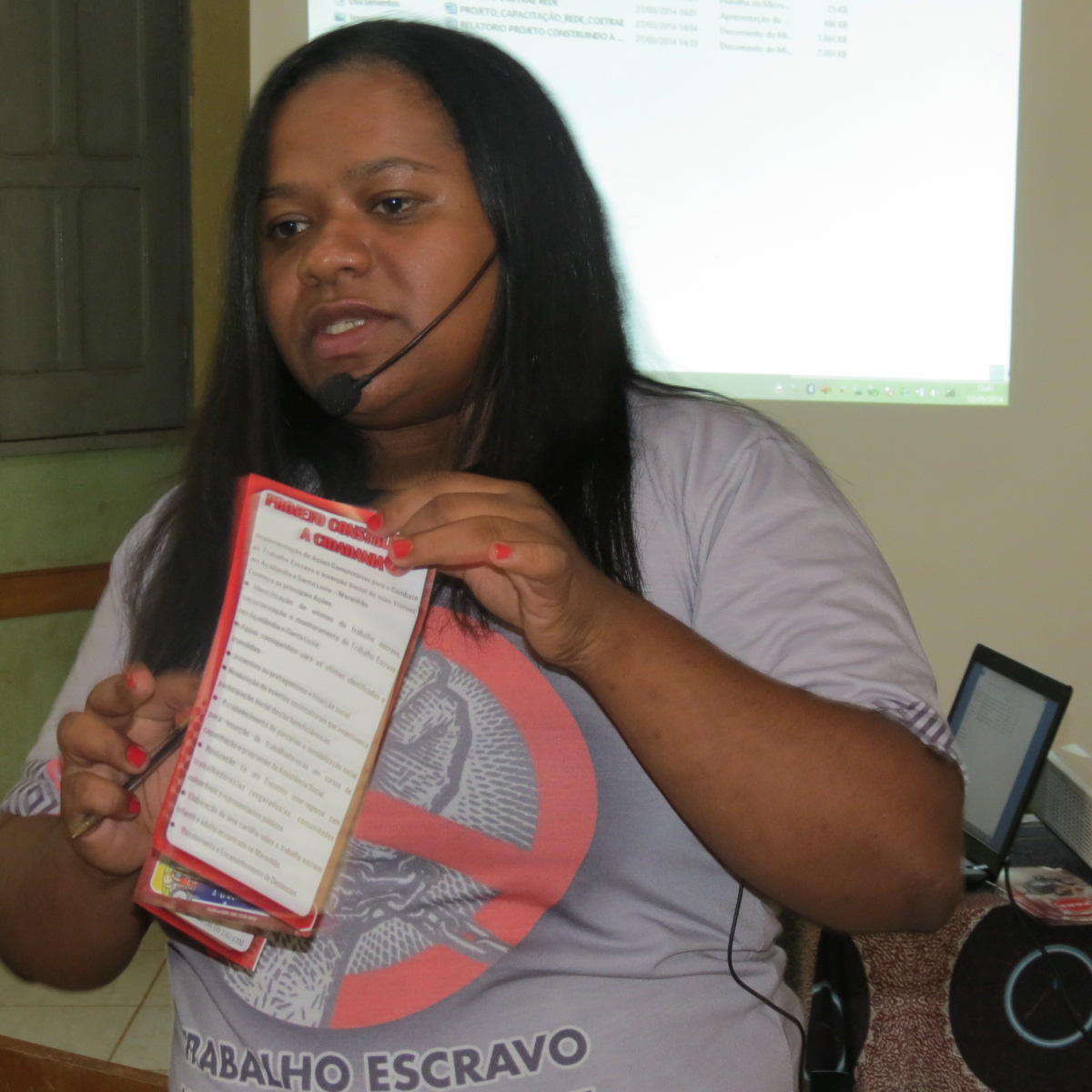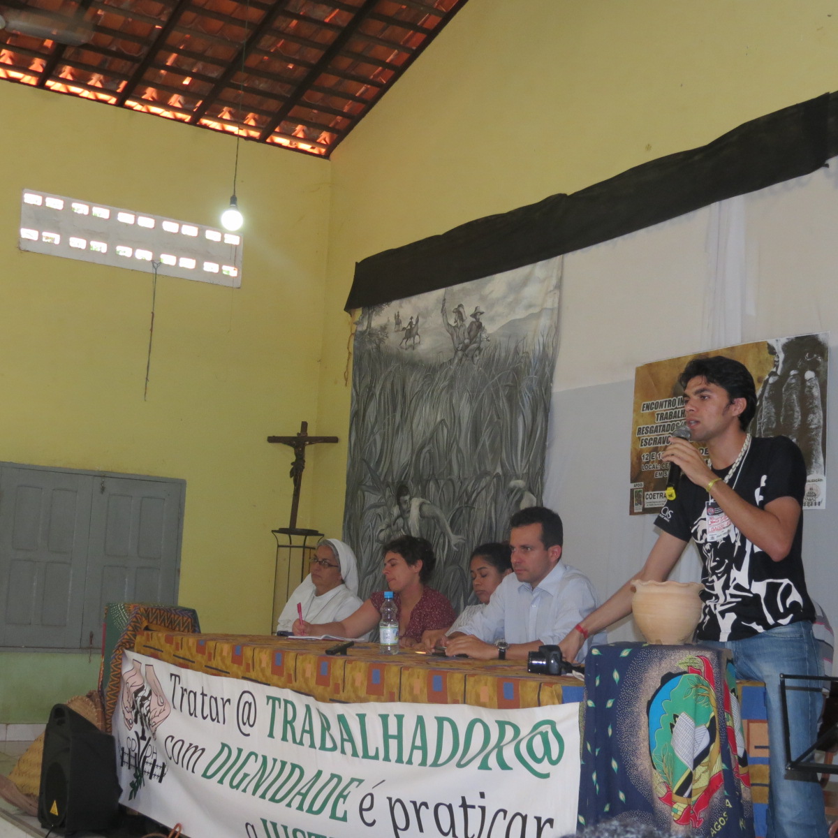 A primeira mesa do encontro foi aberta por Marinaldo Soares Santos, trabalhador que foi resgatado três vezes. Ele não foi o único a relatar que situações de precariedade e falta de acesso a direitos são uma constante na sua vida, mas ao falar em público acerca de suas experiências rompeu com a sensação de impotência a respeito. A agente de cidadania Elbna Carvalho, que atende as demandas dos trabalhadores de municípios da região, falou sobre o trabalho desenvolvido pelo núcleo do CDVDH/CB de Santa Luzia (MA). Na sua apresentação, reforçou a ideia de que os protagonistas do encontro são os próprios trabalhadores, pedindo que eles se apropriassem das discussões e dos espaços do evento.