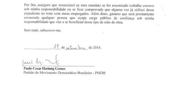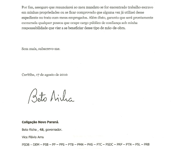 A Carta-Compromisso contra o Trabalho Escravo encerrou, nesta segunda (20), a campanha para coleta de assinaturas de candidatos à Presidência da República e aos governos estaduais. Dilma Rousseff (PT) endossou o documento, renovando a promessa de que o tema será prioridade em sua gestão. A campanha de Aécio Neves (PSDB) recebeu o documento no dia 27 de agosto e, desde então, foi lembrada oito vezes, mas não enviou a assinatura.