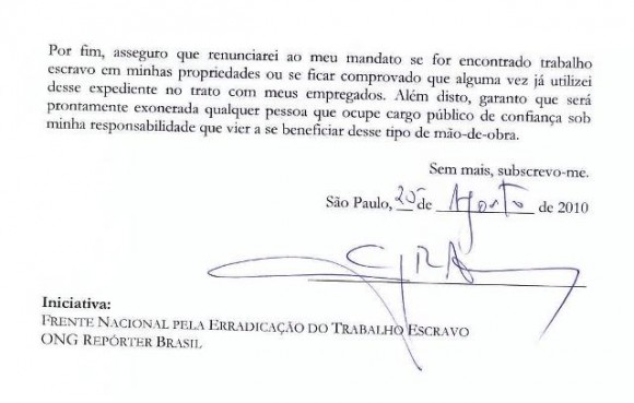 Também estão os compromissos de defender a definição de trabalho análogo ao de escravo hoje presente no artigo 149 do Código Penal, evitando mudanças que prejudiquem o combate a esse crime, e não promover empreendimentos e empresas, dentro ou fora do país, que tenham utilizado mão de obra escrava.