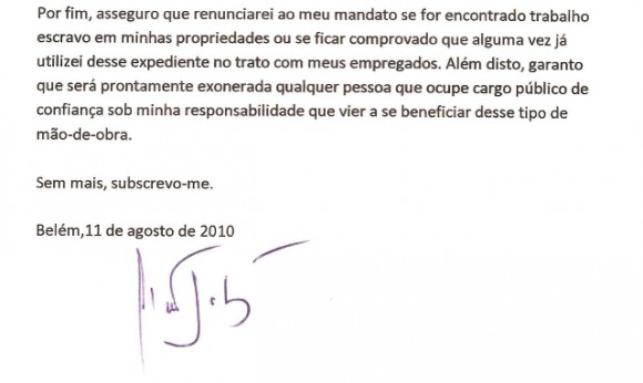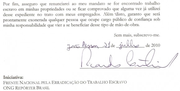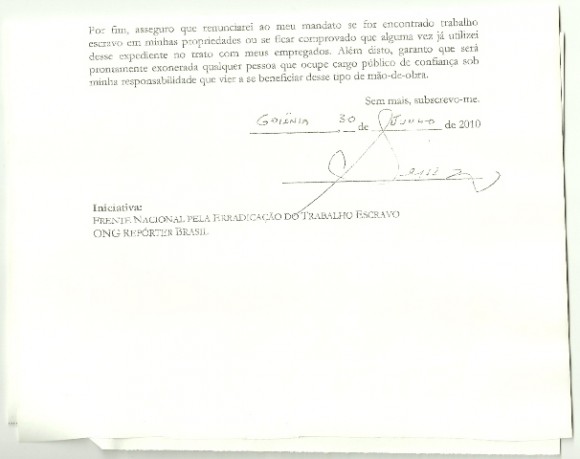 Entre as promessas assumidas, está a de que o candidato ou candidata renunciará ao mandato caso seja encontrado trabalho escravo sob sua responsabilidade ou se ficar comprovado que alguma vez já se utilizou desse expediente. E de que será prontamente exonerada qualquer pessoa que ocupe cargo público de confiança sob sua responsabilidade que vier a se beneficiar desse tipo de mão de obra.