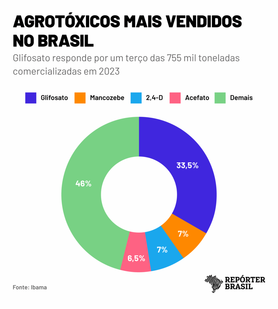 Embora não haja dados específicos por substância, o glifosato é, de longe, o agrotóxico mais utilizado no território nacional, respondendo por 33% das 755 mil toneladas comercializadas em 2023, segundo o Ibama.