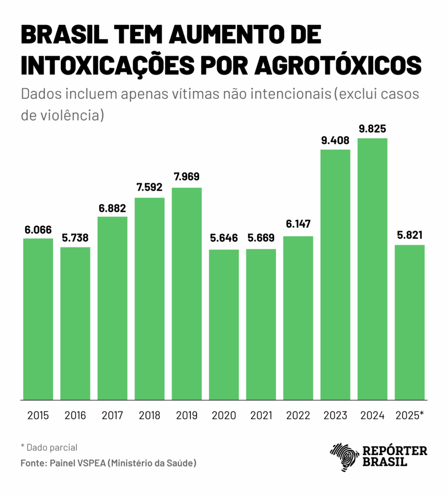 As 1.006 ações judiciais identificadas representam uma pequena fração dos mais de 76 mil casos de intoxicação não intencional por agrotóxico registrados entre 2015 e 2025, segundo o Painel de Vigilância em Saúde das Populações Expostas a Agrotóxicos, do Ministério da Saúde.