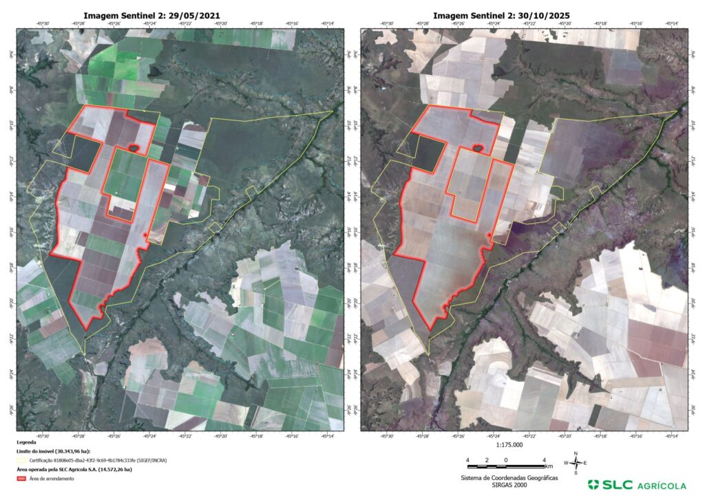 Em relação aos questionamentos enviados, a SLC Agrícola esclarece que, a respeito das áreas citadas, não houve abertura de vegetação entre 2021 e 2025 na área arrendada em que a SLC Agrícola opera desde agosto de 2024, quando foi firmado o contrato de arrendamento que incorporou 14.572 hectares da Fazenda Cosmos à Fazenda Parnaguá, conforme é possível identificar no mapa abaixo.