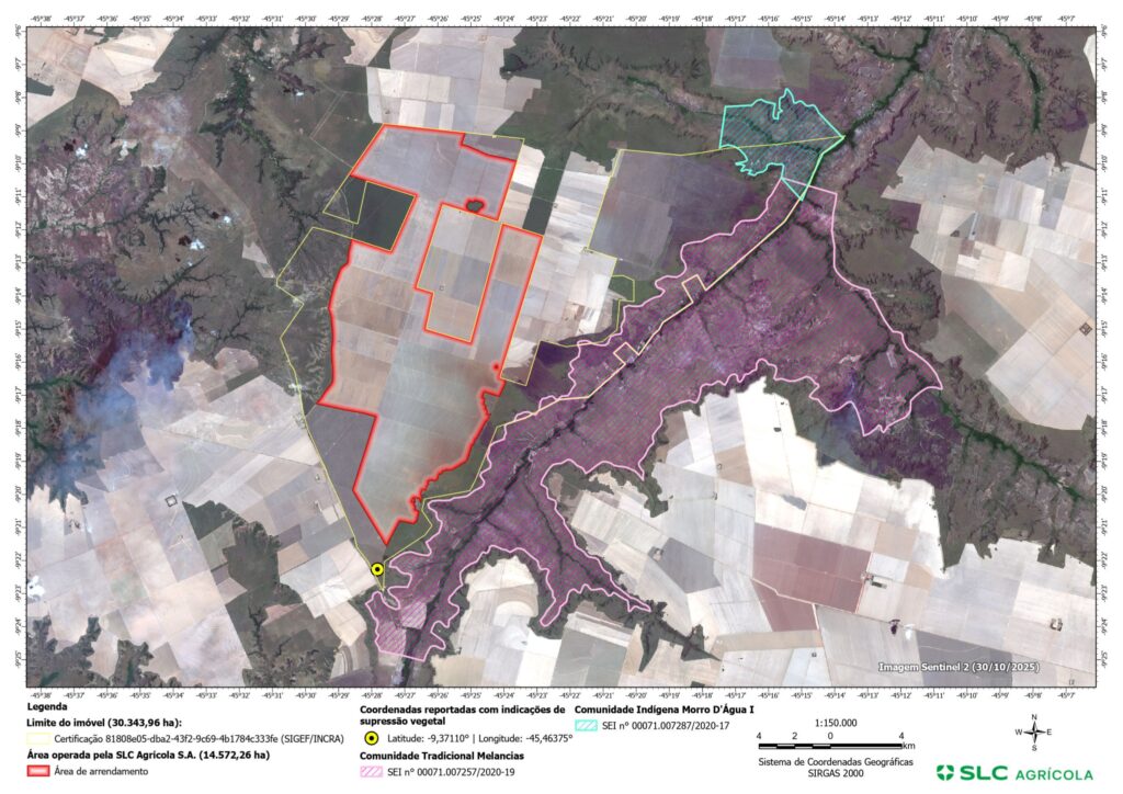 Conforme a imagem acima, a coordenada reportada também fica fora da área de arrendamento da SLC Agrícola.