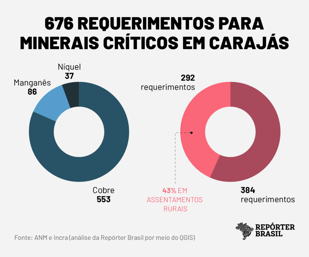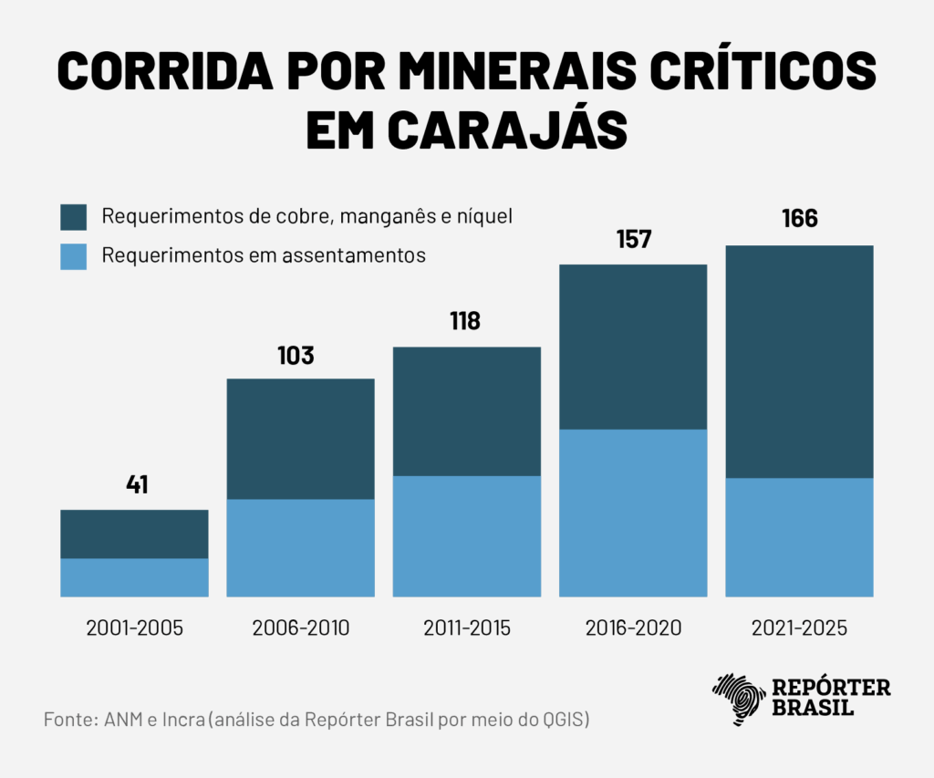 Levantamento exclusivo da Repórter Brasil em parceria com a Mongabay, com base em dados da ANM (Agência Nacional de Mineração), identificou 676 processos minerários de cobre, manganês e níquel na Província Mineral de Carajás desde 1969. Um quarto deles (166) foi protocolado nos últimos cinco anos (2021–2025).