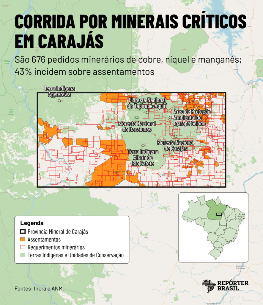 Vizinho ao território dos Xikrin, o assentamento é a área de reforma agrária com o maior número de requerimentos dos minerais de eletrificação em Carajás. São 62 no total: 42 de cobre e 20 de níquel.