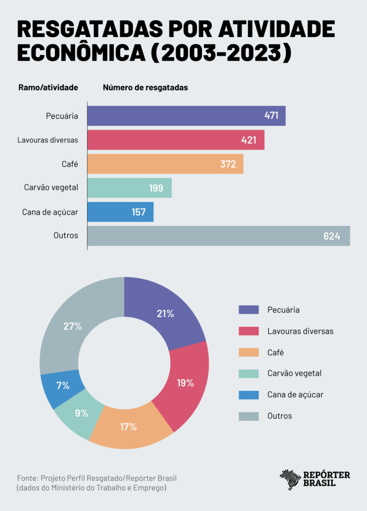 A pecuária concentra 21% dos casos de trabalho escravo feminino no Brasil, considerando tanto os resgates feitos no meio rural quanto os no meio urbano. São 471 casos em 21 anos. Miraglia diz que esse dado indica que trabalhadoras do sexo feminino são escravizadas exercendo os mais diversos tipos de atividade, inclusive aquelas que tradicionalmente seriam feitas só por homens. “Tem muita mulher tocando boi Brasil afora”, exemplifica.